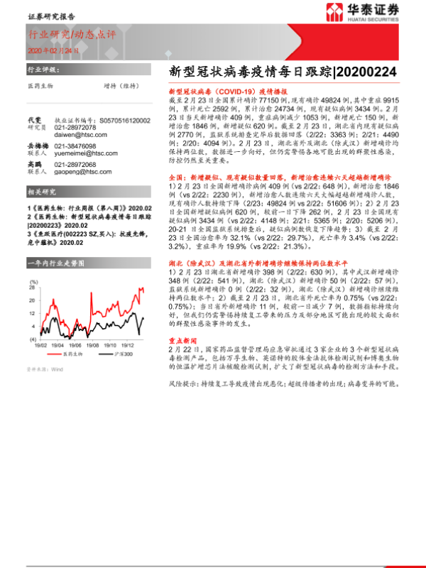 【华泰证券】【20200224】医药生物:新型冠状病毒疫情每日跟踪-4页 行业研究