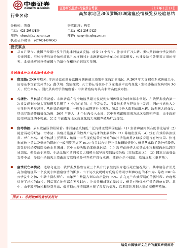 【中泰证券】【20190113】20190113-中泰证券-农林牧渔行业报告:高加索地区和俄罗斯非洲猪瘟疫情概览及经验总结-14页 行业研究