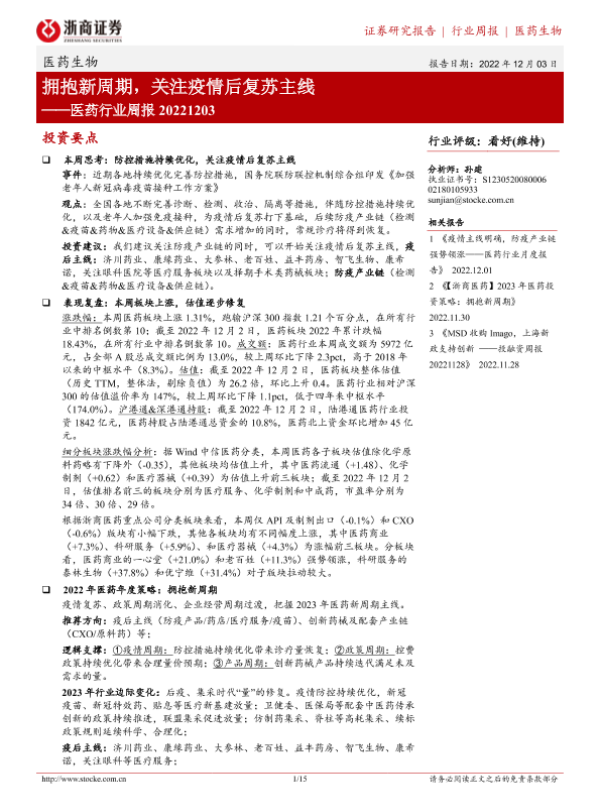 【浙商证券】【20221203】医药行业周报:拥抱新周期,关注疫情后复苏主线-15页 行业研究