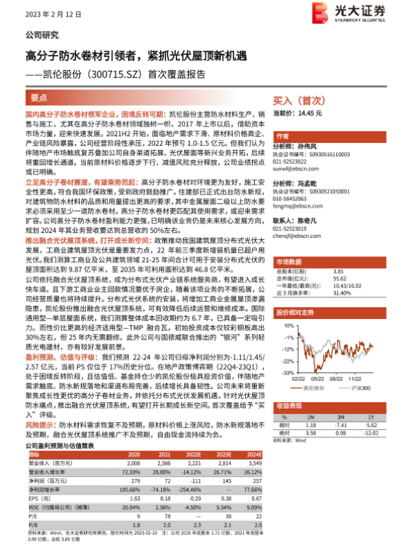 【光大证券】【20230212】20230212-光大证券-凯伦股份-300715.SZ-首次覆盖报告:高分子防水卷材引领者,紧抓光伏屋顶新机遇-26页 行业研究