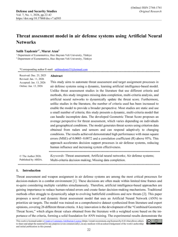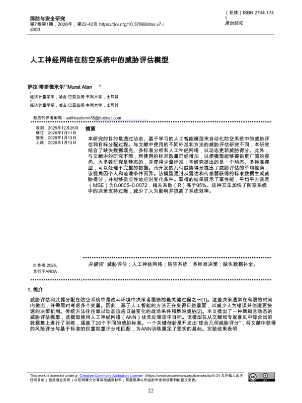 【哈吉&巴亚拉姆&韦利大学经济计量学系】【2026】人工神经网络在防空系统中的威胁评估模型-21页 学术论文