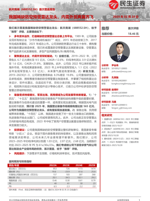【民生证券】【20240224】20240224-民生证券-航天南湖-688552.SH-首次覆盖报告:我国稀缺防空预警雷达龙头,内需外贸两翼齐飞-23页 行业研究