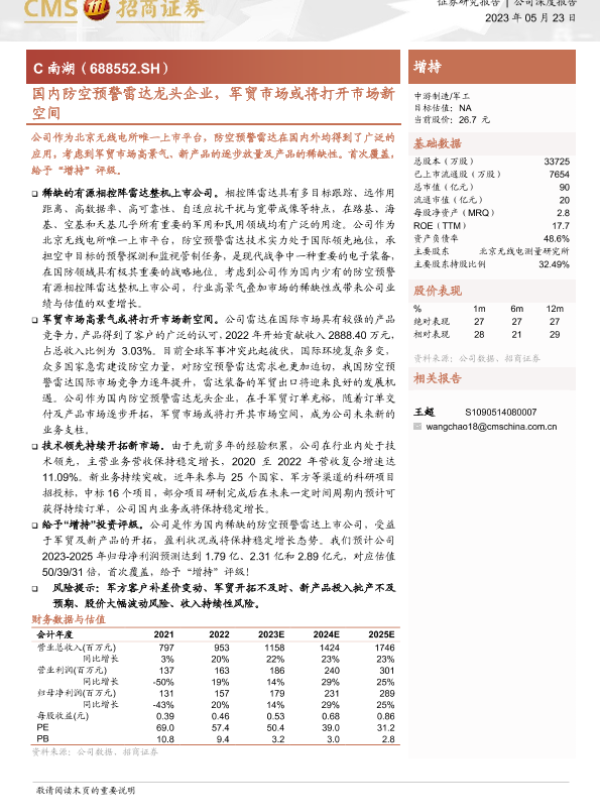 【华安证券】【20230530】航天南湖(688552)防空预警雷达领军者-23页 行业研究
