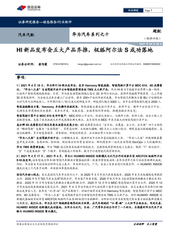 【国信证券】【20210420】华为汽车系列之十:HI新品发布会五大产品齐推,极狐阿尔法S成功落地-16页 行业研究