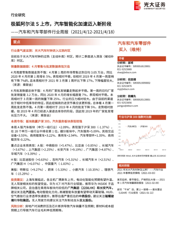 【光大证券】【20210419】汽车和汽车零部件行业周报:极狐阿尔法S上市,汽车智能化加速迈入新阶段-21页 行业研究