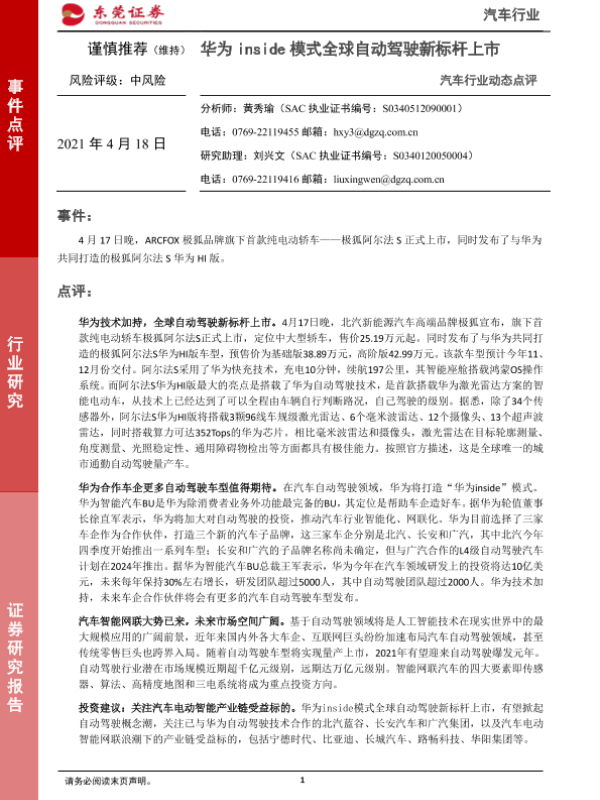 【东莞证券】【20210418】汽车行业动态点评:华为inside模式全球自动驾驶新标杆上市-3页 行业研究