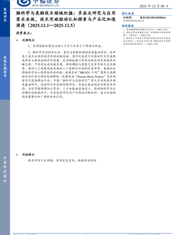 【华福证券】【202512】脑科学与类脑技术领域把握:多层次研究与应用需求共振,技术突破驱动认知探索与产业化加速演进-8页 证券期货研究报告