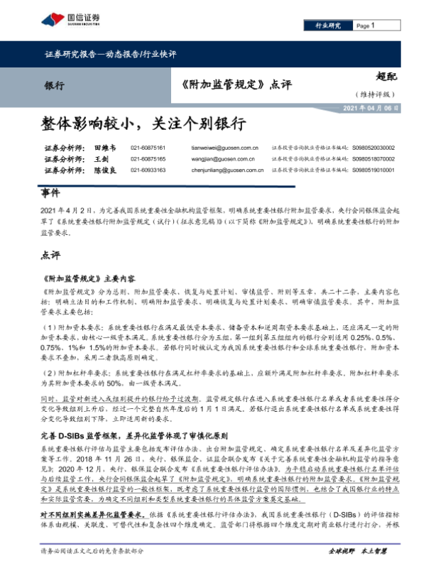 【国信证券】【20210406】《附加监管规定》点评-整体影响较小,关注个别银行-6页 行业研究