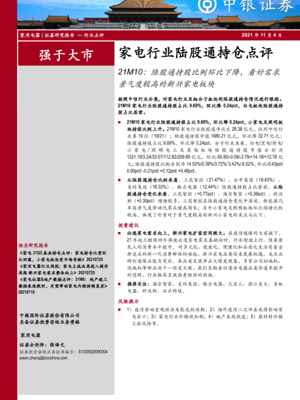 【中银证券】【20211104】21M10:陆股通持股比例环比下降,看好需求景气度较高的新兴家电板块-19页 行业研究