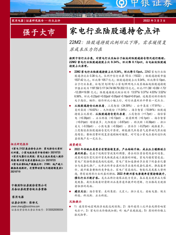 【中银证券】【20220303】家电行业陆股通持仓点评:22M2,陆股通持股比例环比下降,需求缓慢复苏成本压力仍在-19页 行业研究