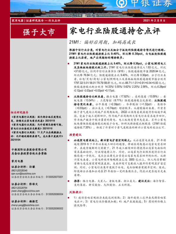 【中银证券】【20210208】20210208-中银证券-家电行业陆股通持仓点评:21M1:偏好后周期,加码高成长-13页 行业研究