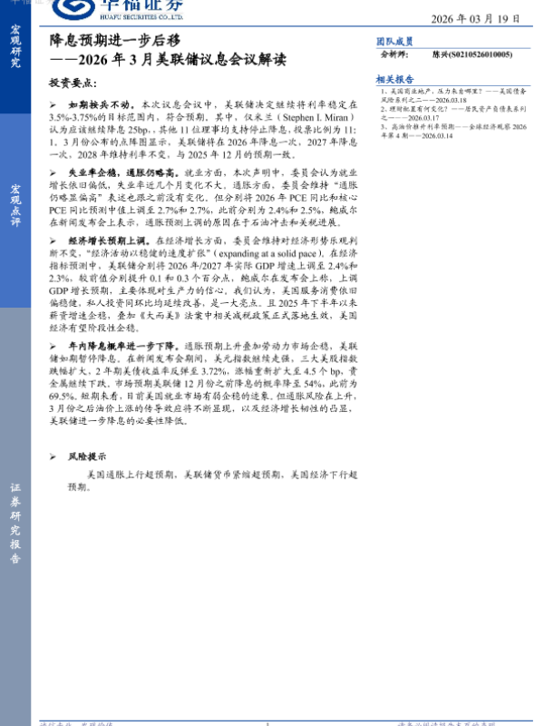 【华福证券】【202603】降息预期进一步后移——2026年3月美联储议息会议解读-6页 证券期货研究报告