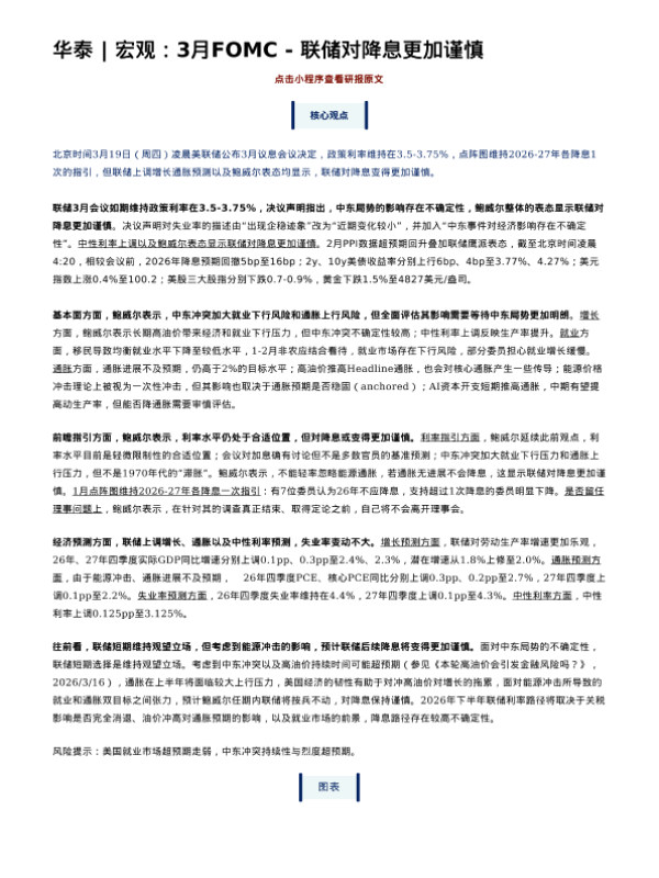 【华泰证券】【202603】3月FOMC:联储对降息更加谨慎-5页 证券期货研究报告