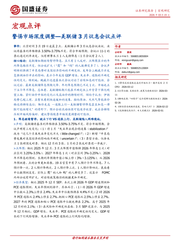 【国盛证券】【202603】警惕市场深度调整—美联储 3月议息会议点评-7页 证券期货研究报告