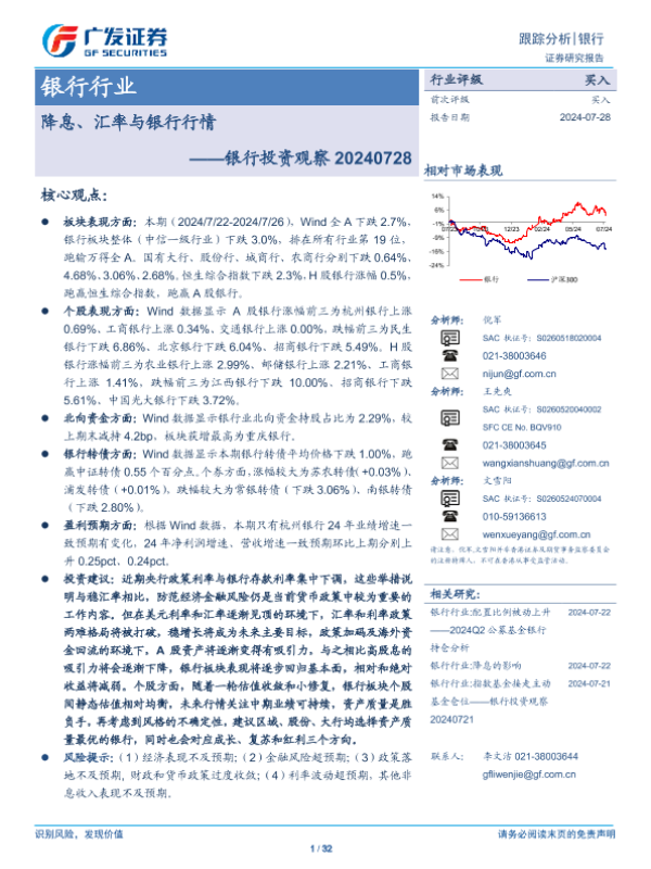 【广发证券】【20240728】银行投资观察:降息、汇率与银行行情-32页 行业研究