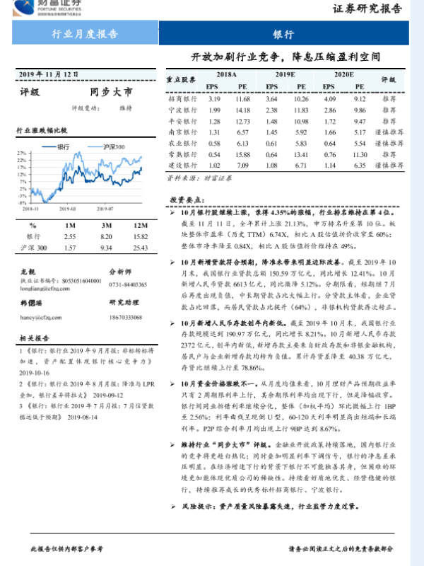 【财信证券】【20191112】银行行业月度报告:开放加剧行业竞争,降息压缩盈利空间-10页 行业研究