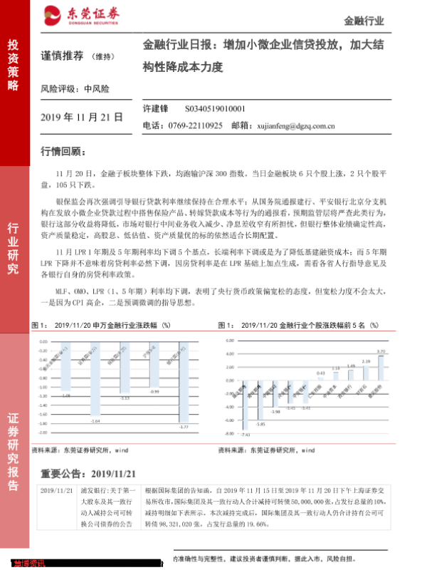 【东莞证券】【20191121】金融行业日报:增加小微企业信贷投放,加大结构性降成本力度-4页 行业研究