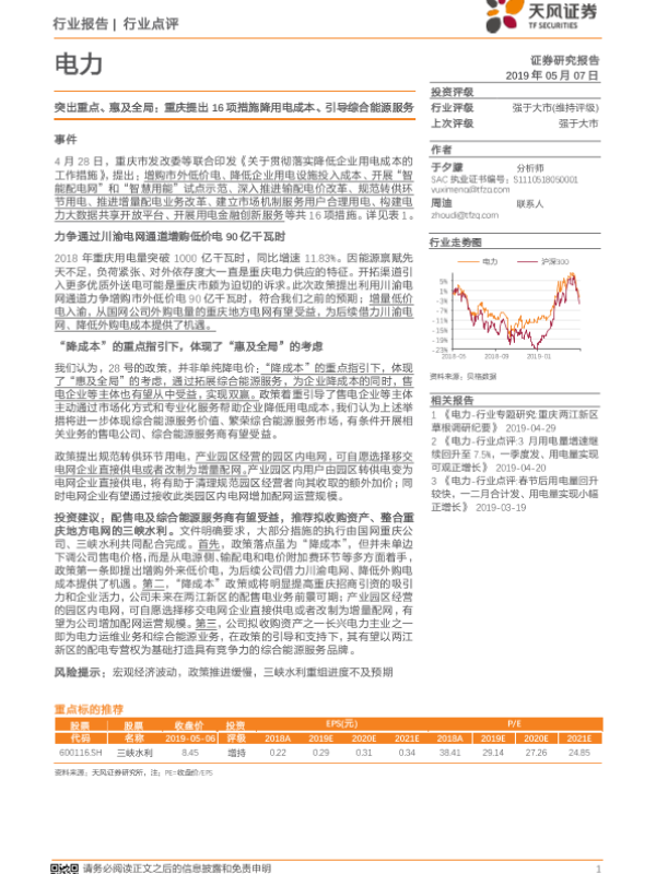 【天风证券】【20190512】重庆提出16项措施降用电成本、引导综合能源服务,看好三峡水利-13页 行业研究