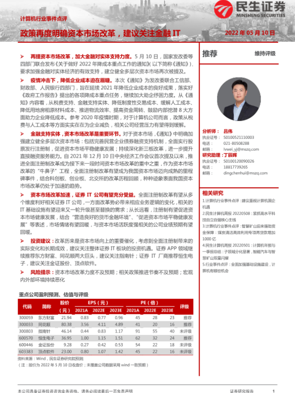 【民生证券】【20220510】计算机行业事件点评:政策再度明确资本市场改革,建议关注金融IT-2页 行业研究