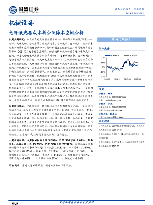 【国盛证券】【20190804】机械设备行业周报:光纤激光器成本拆分及降本空间分析-24页 行业研究