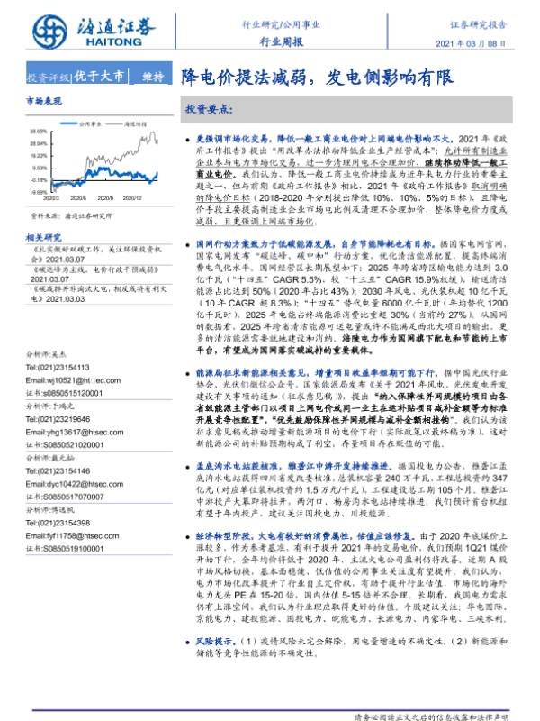 【海通证券】【20210308】公用事业行业周报:降电价提法减弱,发电侧影响有限-2页 行业研究
