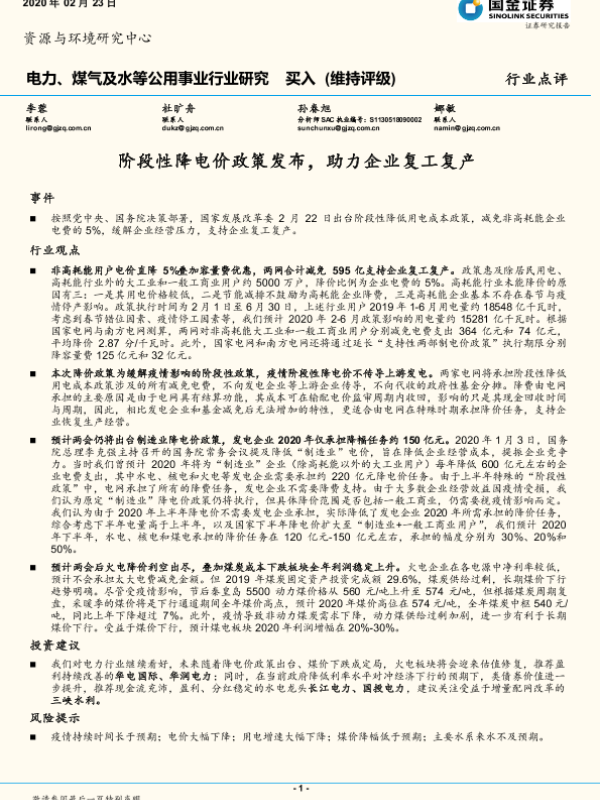 【国金证券】【20200223】阶段性降电价政策发布,助力企业复工复产-3页 行业研究