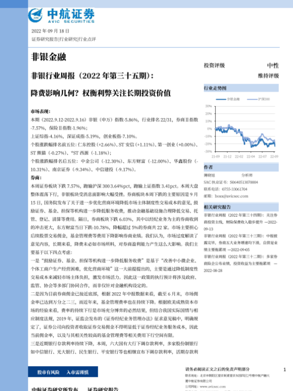 【中航证券】【20220918】非银行业周报:降费影响几何?权衡利弊关注长期投资价值-13页 行业研究