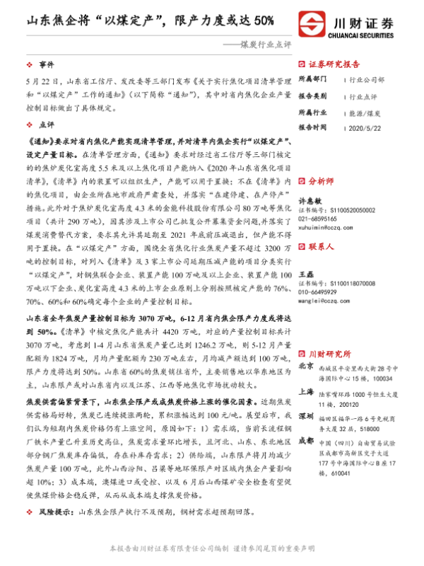 【川财证券】【20200522】煤炭行业点评:山东焦企将“以煤定产”,限产力度或达50%-2页 证券期货研究报告