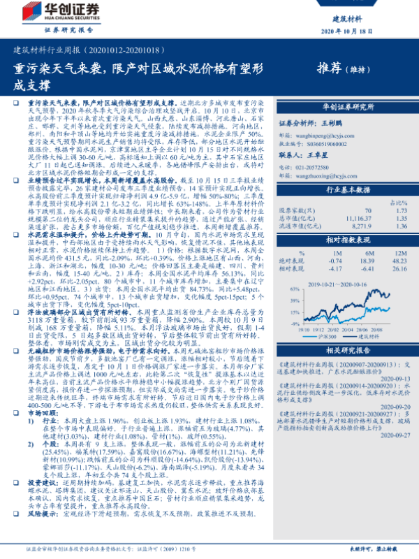 【华创证券】【20201018】建筑材料行业周报:重污染天气来袭,限产对区域水泥价格有望形成支撑-16页 行业研究