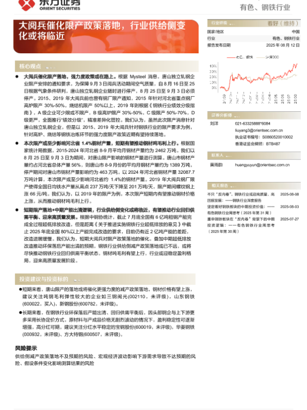 【东方证券】【20250812】有色、钢铁行业动态跟踪:大阅兵催化限产政策落地,行业供给侧变化或将临近-3页 证券期货研究报告