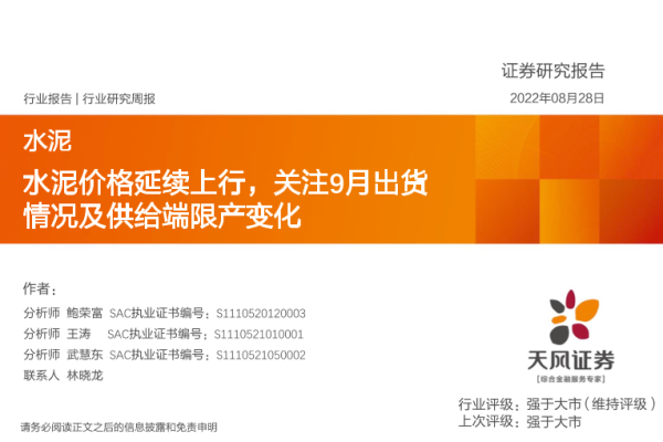 【天风证券】【20220828】水泥行业研究周报:水泥价格延续上行,关注9月出货情况及供给端限产变化-21页 行业研究