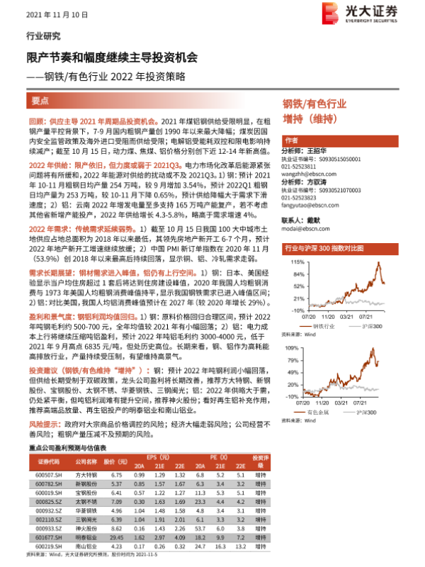 【光大证券】【20211110】钢铁 有色行业2022年投资策略:限产节奏和幅度继续主导投资机会-48页 行业研究