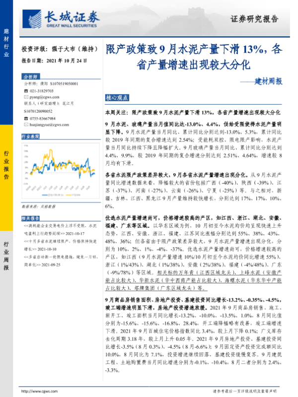 【长城证券】【20211024】建材周报:限产政策致9月水泥产量下滑13%,各省产量增速出现较大分化-25页 行业研究