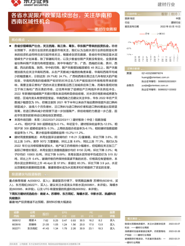 【东方证券】【20220315】建材行业周报:各省水泥限产政策陆续出台,关注华南和西南区域性机会-23页 行业研究