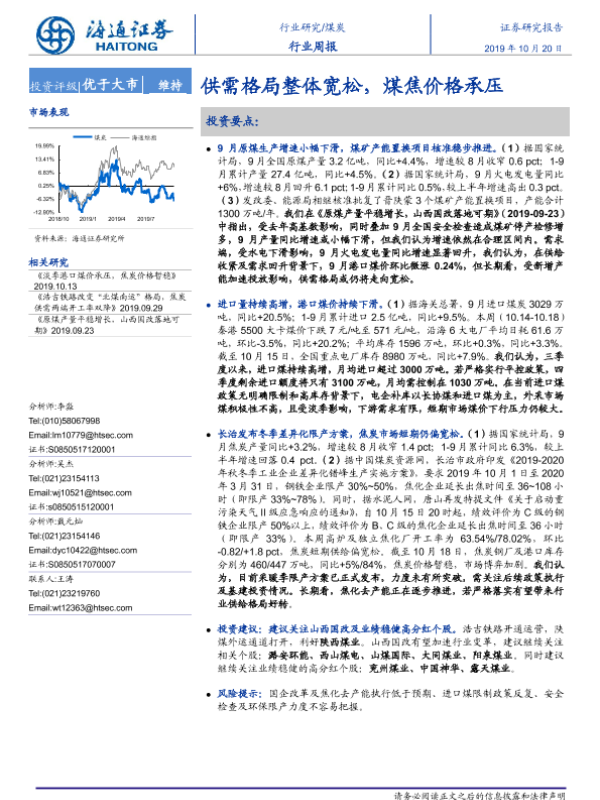 【海通证券】【20191020】20191020-海通证券-煤炭行业周报:供需格局整体宽松,煤焦价格承压-2页 行业研究