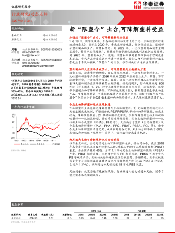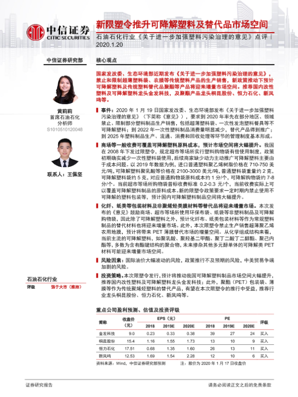 【华泰证券】【20200120】基础化工动态点评:新“限塑令”出台,可降解塑料受益-3页 行业研究