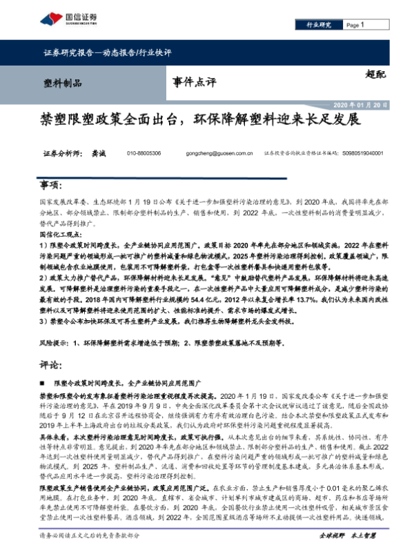 【国信证券】【20200120】塑料制品事件点评:禁塑限塑政策全面出台,环保降解塑料迎来长足发展-6页 行业研究
