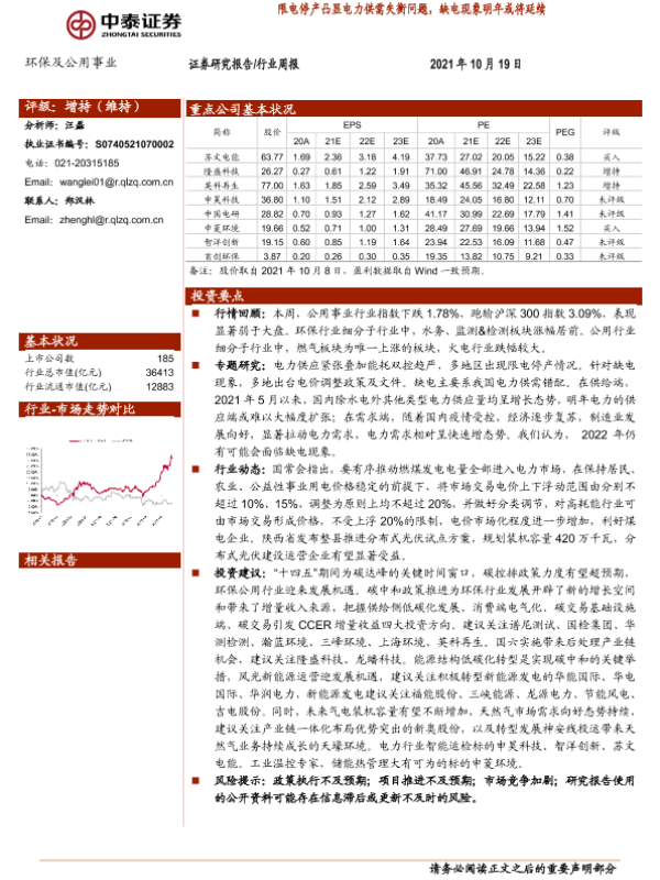 【中泰证券】【20211019】环保及公用事业行业周报:限电停产凸显电力供需失衡问题,缺电现象明年或将延续-22页 行业研究