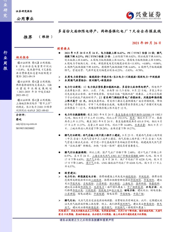 【兴业证券】【20210926】多省份大面积限电停产,两部委强化电厂7天安全存煤底线-14页 行业研究