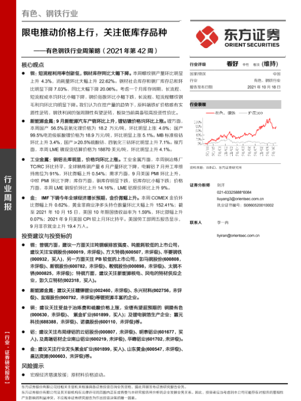 【东方证券】【20211018】有色钢铁行业周策略(2021年第42周):限电推动价格上行,关注低库存品种-30页 行业研究