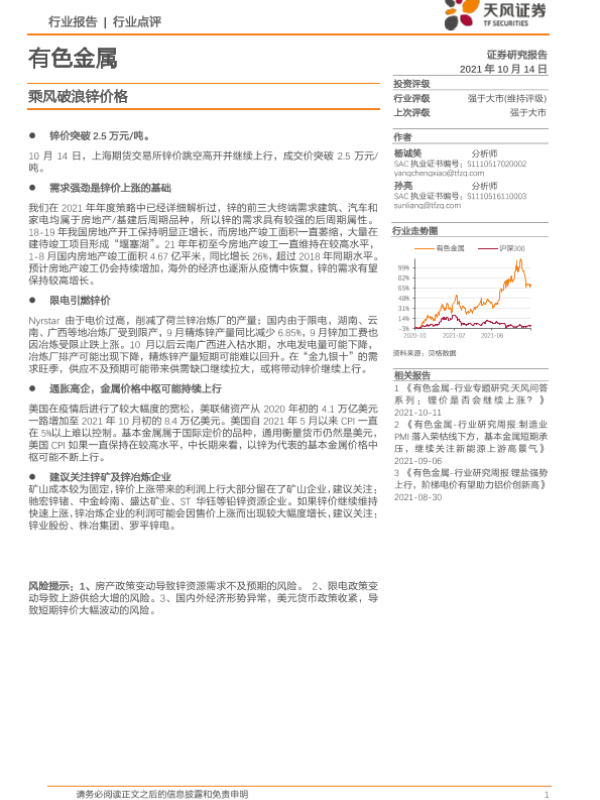 【天风证券】【20211014】有色金属行业点评:乘风破浪锌价格-2页 行业研究