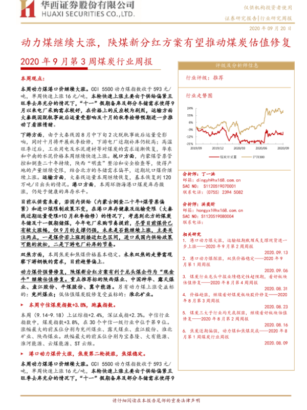 【华西证券】【20200920】2020年9月第3周煤炭行业周报:动力煤继续大涨,陕煤新分红方案有望推动煤炭估值修复-22页 行业研究