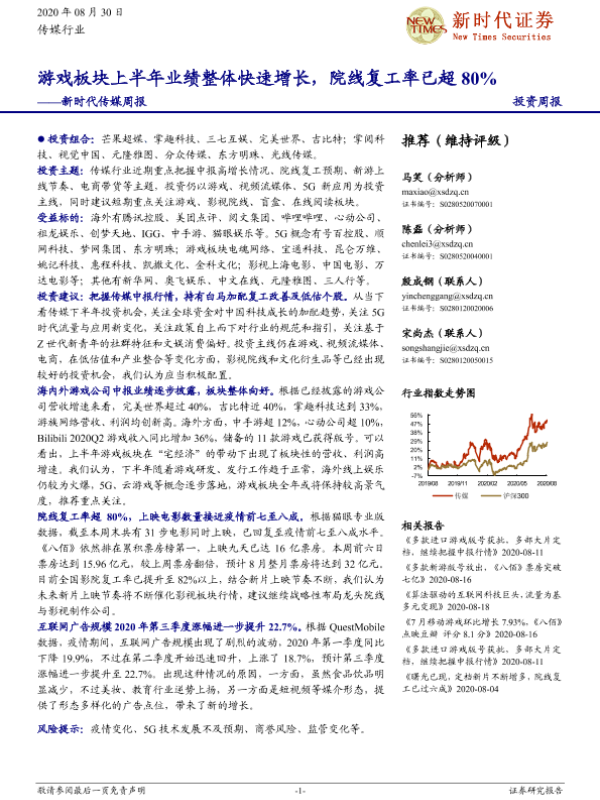 【新时代证券】【20200830】新时代传媒周报:游戏板块上半年业绩整体快速增长,院线复工率已超80%-45页 行业研究