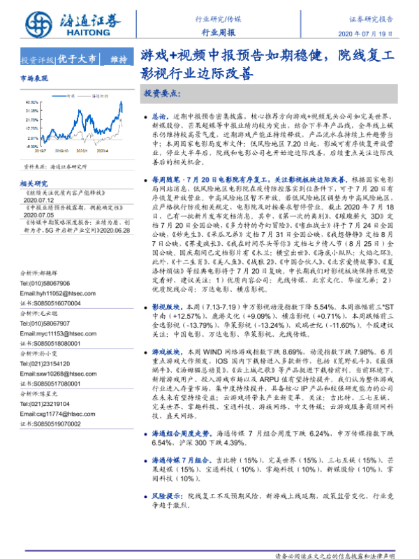 【海通证券】【20200719】20200719-海通证券-传媒行业周报:游戏+视频中报预告如期稳健,院线复工影视行业边际改善-10页 行业研究