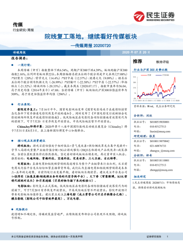 【民生证券】【20200720】20200720-民生证券-传媒周报:院线复工落地,继续看好传媒板块-18页 行业研究
