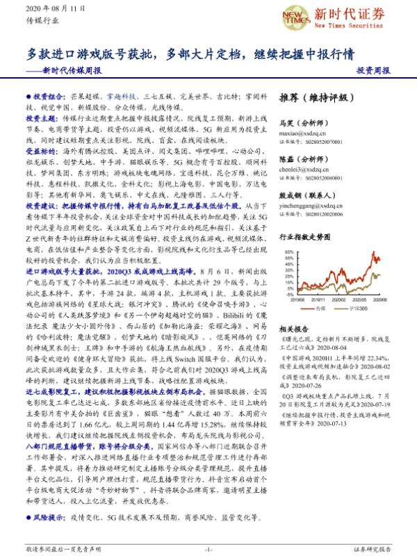 【新时代证券】【20200811】新时代传媒周报:多款进口游戏版号获批,多部大片定档,继续把握中报行情-36页 行业研究