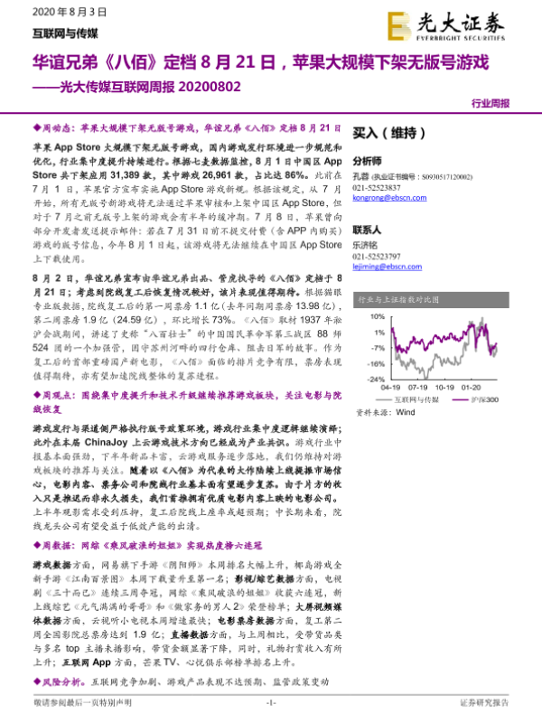 【光大证券】【20200803】光大传媒互联网周报:华谊兄弟《八佰》定档8月21日,苹果大规模下架无版号游戏-12页 行业研究