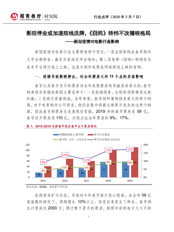 【招商银行】【20200207】新冠疫情对电影行业影响:影院停业或加速院线洗牌,《囧妈》转档不改播映格局-4页 行业研究
