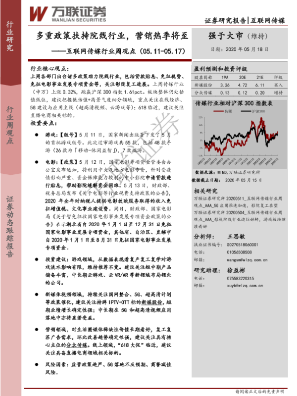 【万联证券】【20200518】20200518-万联证券-互联网传媒行业周观点:多重政策扶持院线行业,营销热季将至-13页 行业研究