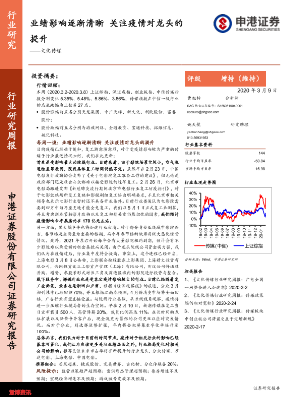 【申港证券】【20200309】20200309-申港证券-文化传媒行业研究周报:业绩影响逐渐清晰关注疫情对龙头的提升-17页 行业研究